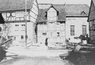 Historisches Foto (undatiert) : Blick aus der Schmiedegasse in den Hackelberg, im Hitergrudn die Kirche