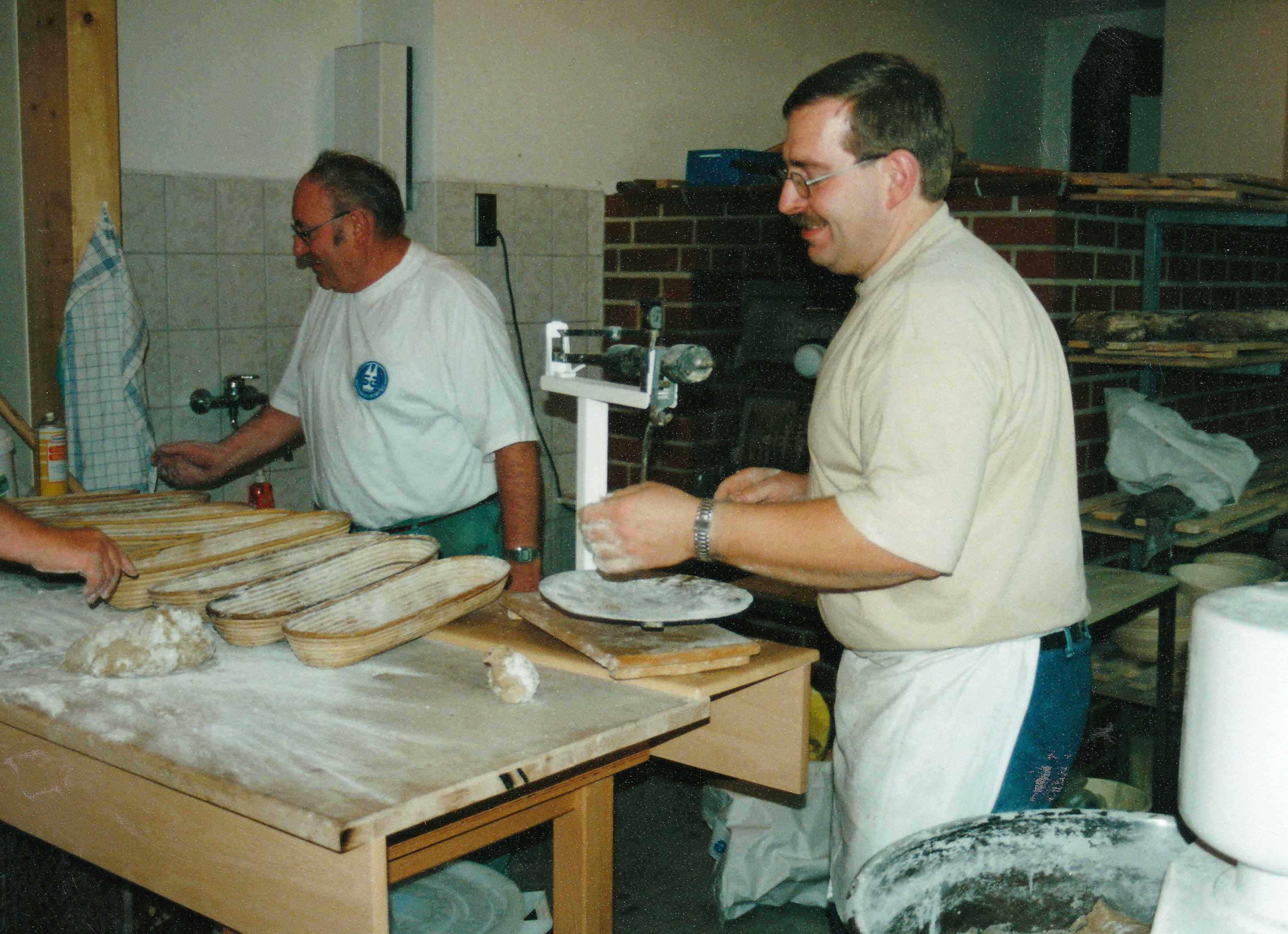 Willi Gerhold und Herbert Mathe beim Brotteig formen