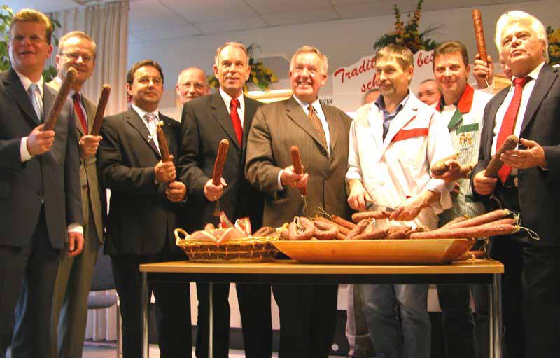 Patentschutz für die “Ahle Worscht” - stellvertr. Landesinnungsmeister des Fleischerverbandes Hessen, Rudi Döring, mit den nordhessischen Landräten, dem Regierungspräsidenten und weiteren Fleischermeistern im Nov. 2005: